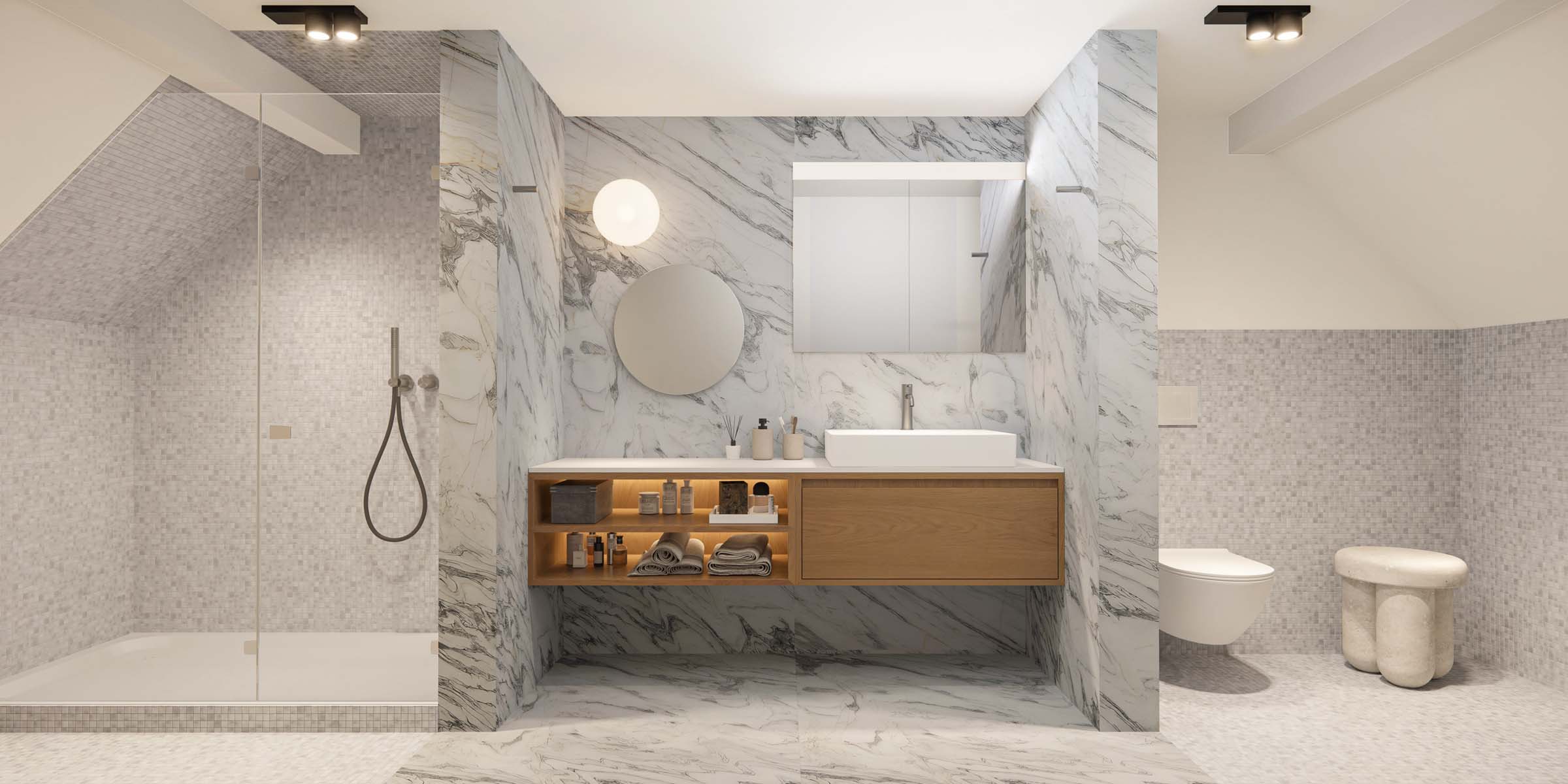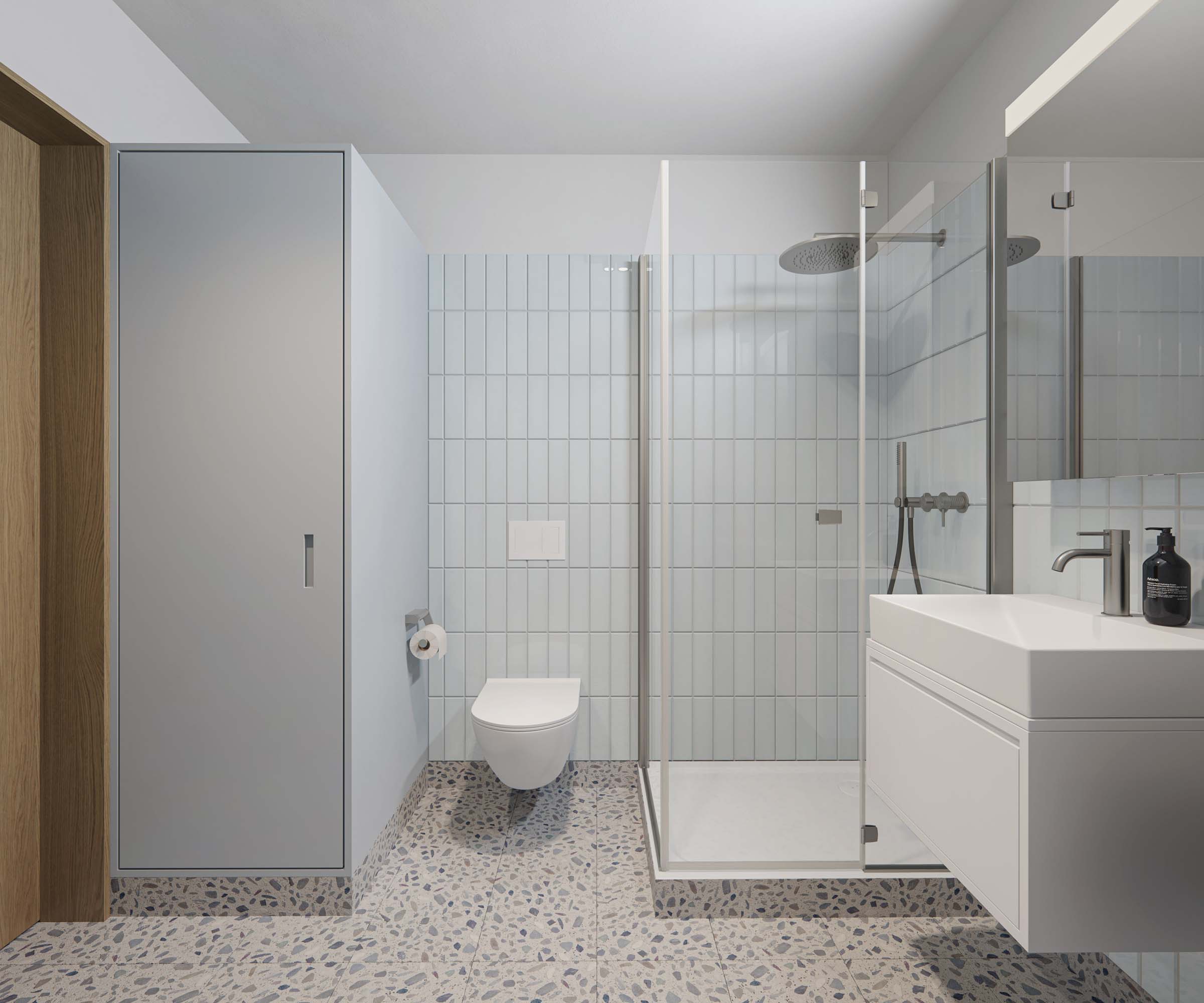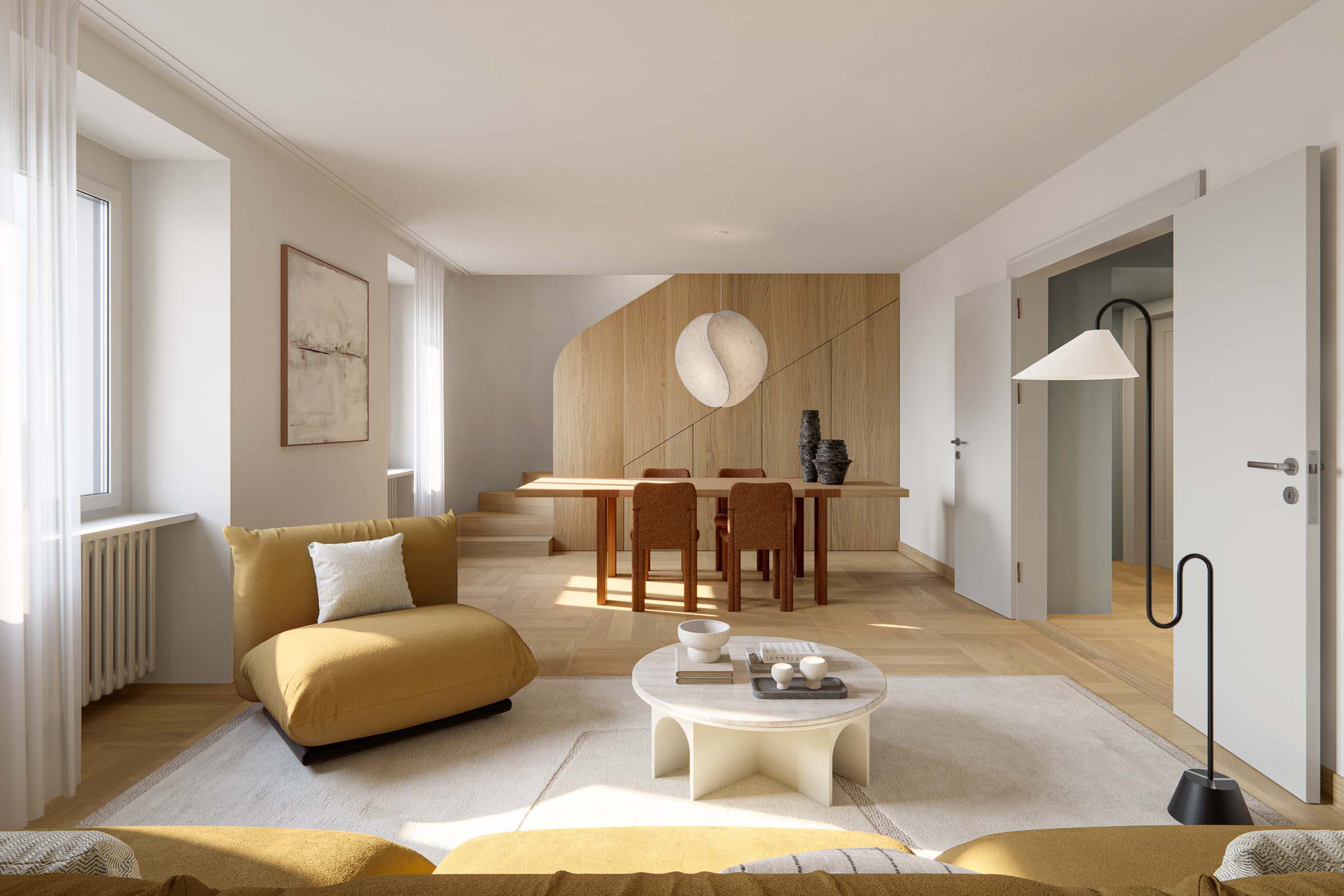 Das Wohnungsprogramm entspricht den vielfältigen Bedürfnissen einer urbanen Bewohnerschaft. Die Souterrain-Wohnung bietet mit ihrem ebenerdigen Studio-Bereich und dem mit Tageslicht erhellten Atelier einen vielfältig nutzbaren Lebensraum für den kreativen Single-Haushalt. Die 2.0- und 3.0-Zimmerwohnungen im EG und in den Obergeschossen schaffen mit ihrem geschmackvoll-modernen Ausbaukonzept eine unvergleichliche Wohnatmosphäre. Eine zweiseitige Belichtung und eine kompakte Raumaufteilung, die keinen Quadratmeter verschenkt, verleihen diesen vielseitig nutzbaren Stadtwohnungen zusätzlichen Reiz. Zuoberst thronen die beiden Maisonette-Dachwohnungen. Als einzigartiges Plus verfügen sie über je eine private Dachterrasse mit wunderbarer Aussicht über die Stadt.